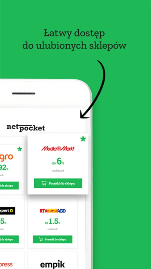 • W aplikacji Net-Pocket masz pełen dostęp do sklepów partnerskich i oferowanego przez daną sieć cashbacku. Co więcej, możesz zapisywać ulubione sklepy gwiazdką, aby wrócić do niego w dowolnym momencie!