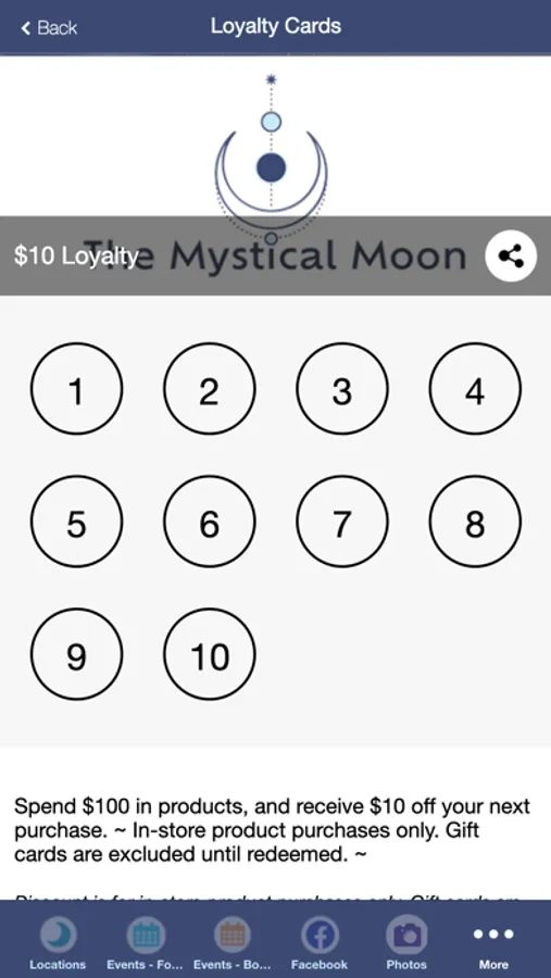 The Mystical Moon App offers weekly sales, psychic development tips, and location information. Plus earn loyalty points for future discounts! Stay updated with our online calendar and learn more about the services offered at the Mystical Moon.