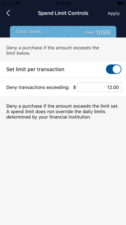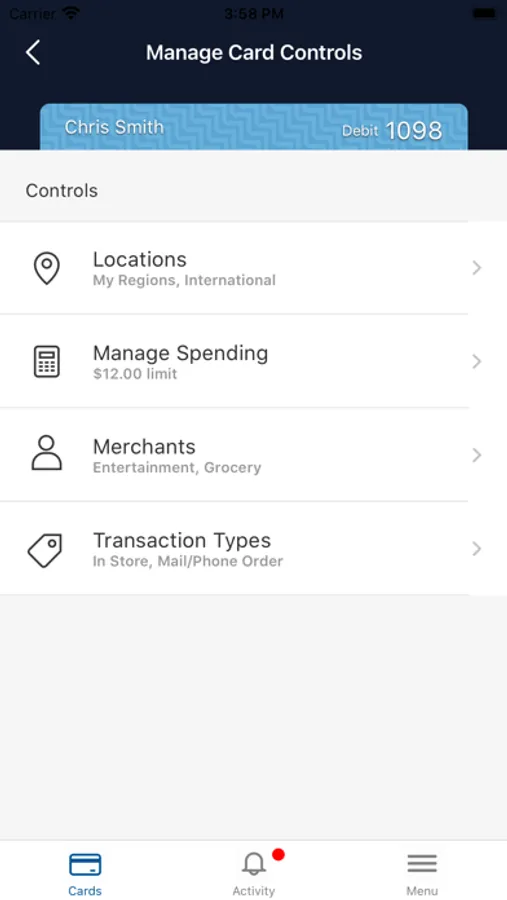 Spending limits can be established to allow transactions up to a certain dollar value and decline transactions when amounts exceed your defined thresholds. Transactions can be monitored and managed for specific merchant categories such as gas stations, department stores, restaurants entertainment, travel, and groceries. And your transactions can also be monitored for specific transaction types: in-store purchases, e-commerce transactions, mail/phone orders and ATM transactions.