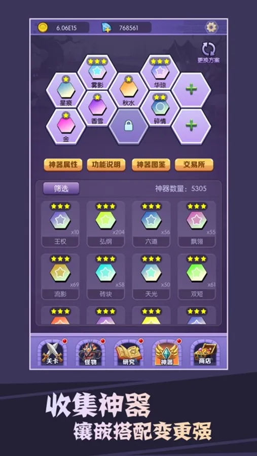 2.神器系统:神器的属性强大无比,所有的怪物都会受到神器的加强。不仅如此,神器还可以镶嵌,带来更多属性提升!