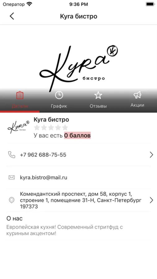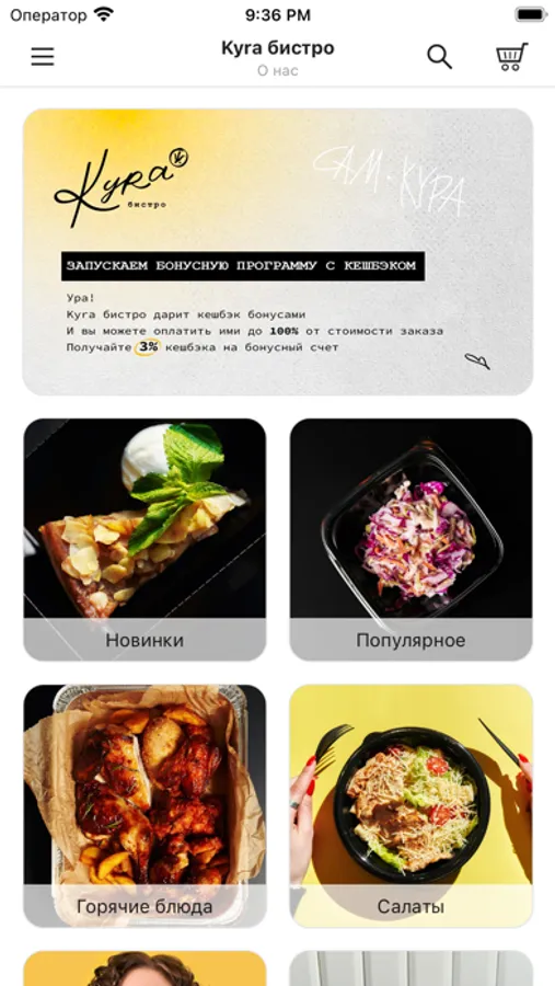 Привет, это Kyra! Я создаю современный формат заведений, вдохновленный европейскими бистро. Актуальное сочетание здорового питания и популярного стритфуд движения. У нас есть приложение, а у приложения есть простая задача делать нашу куру еще ближе к Вам.