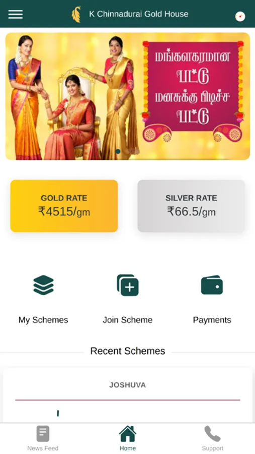 Save gold in K Chinnadurai Gold House App with up-to-date gold rate information, payment reminders and easy payment options. Also, cherish the new News Feed feature exclusive only at K Chinnadurai Gold House App