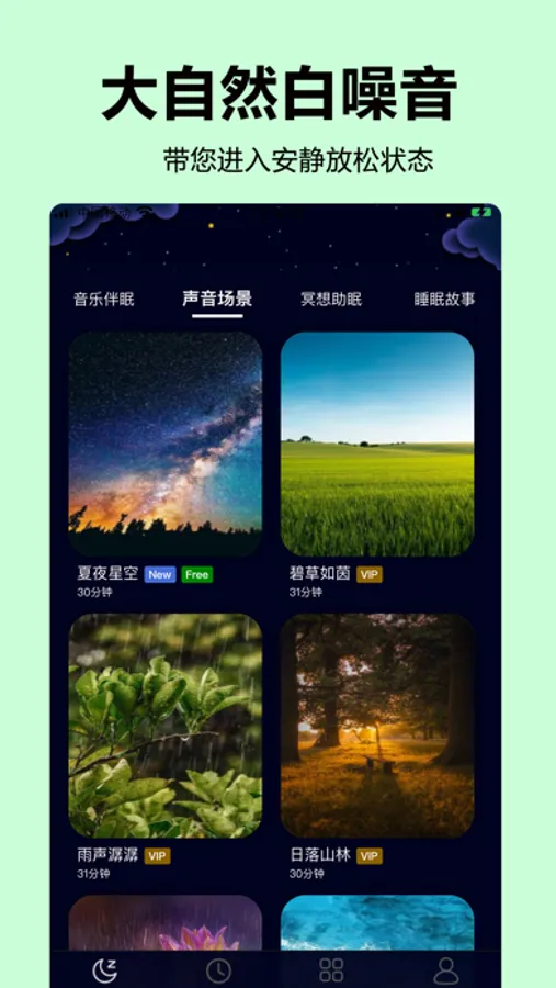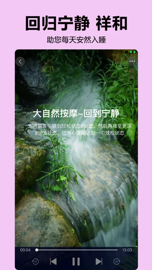 1:提供睡前自然界白噪音,带您走进安静,放松的场景。