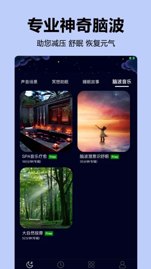 1:提供专业的神奇脑波,让大脑随着不同类型的脑波声音,调节您的脑波频率,帮助您获得减压、舒眠、元气恢复等效果。