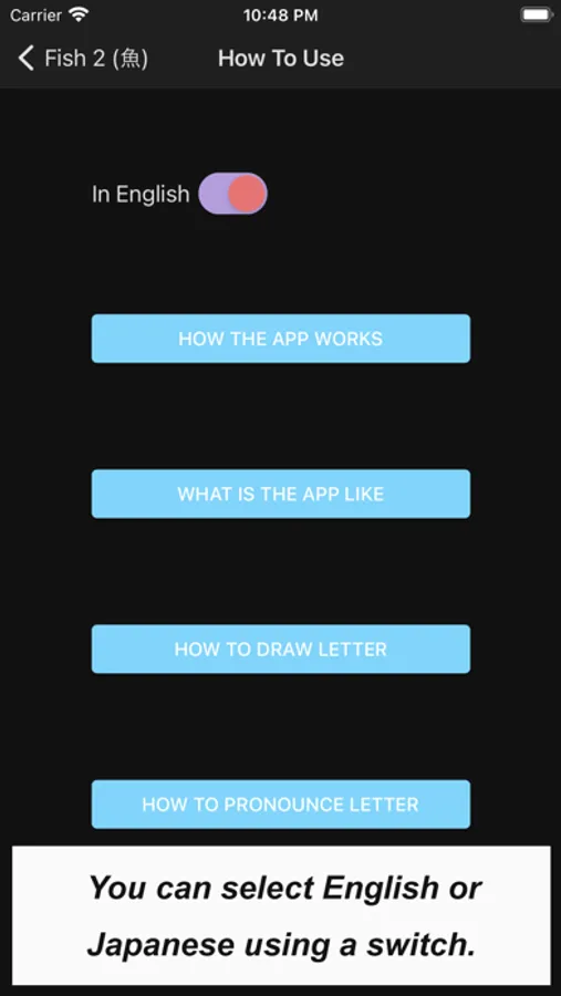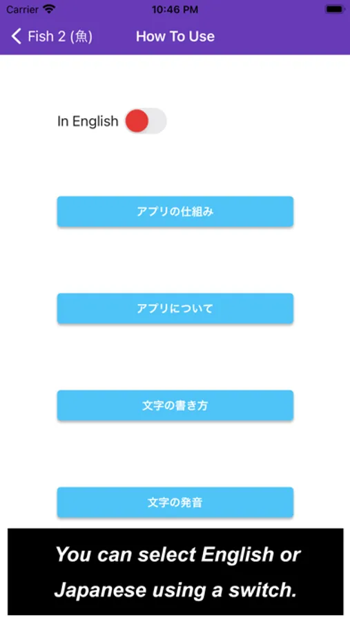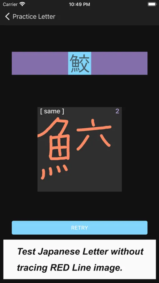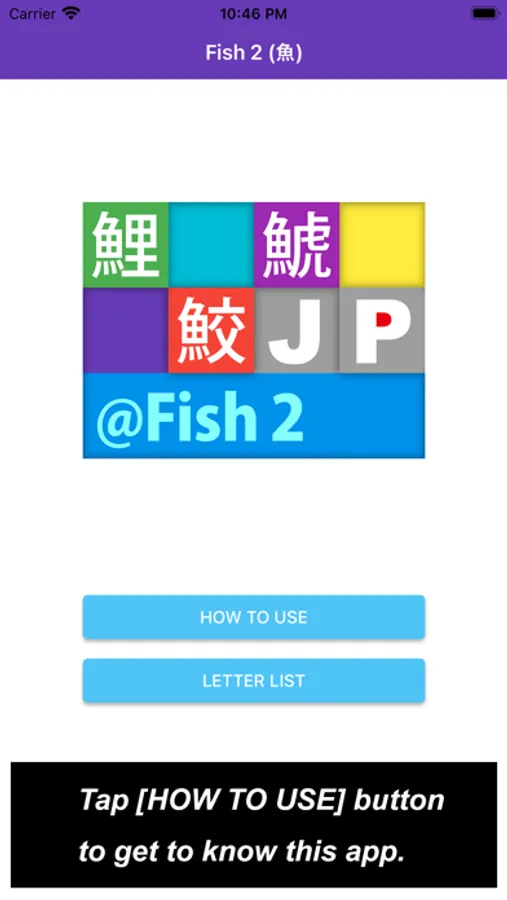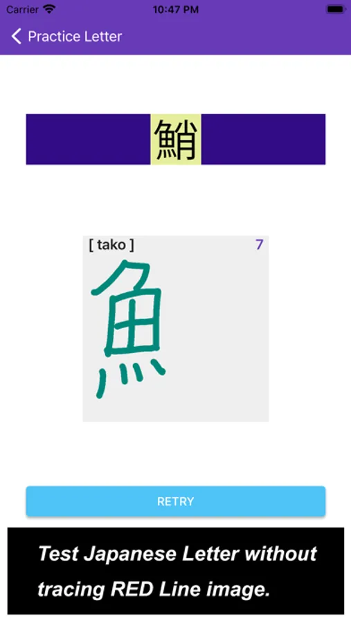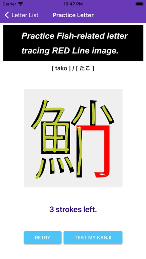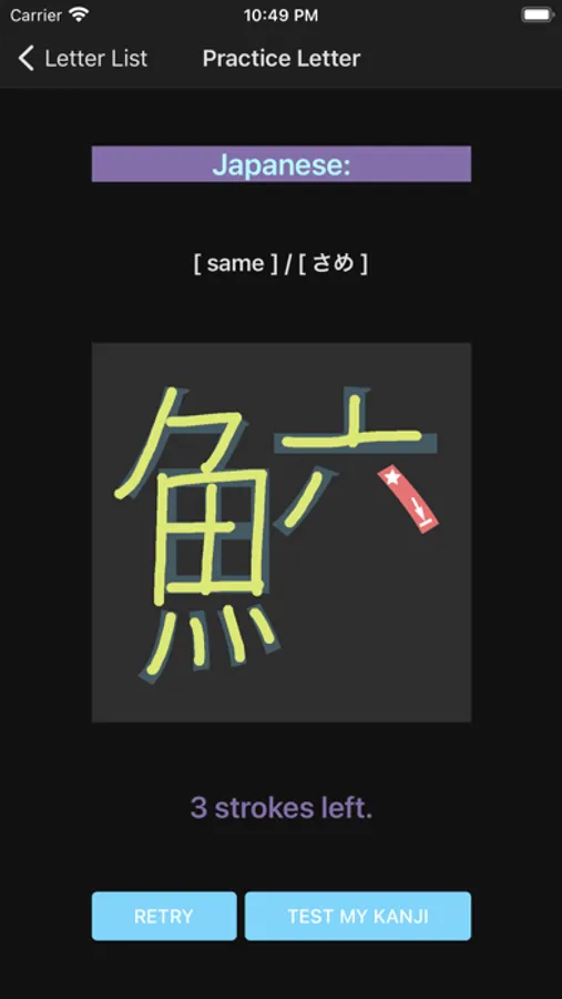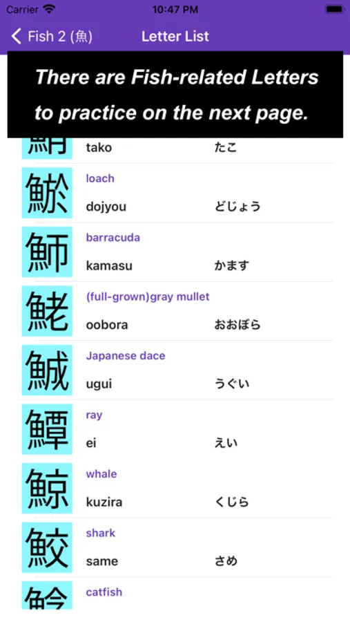 The app also focuses on a single Kanji letter. All letters that you practice on JP Fish app mean fish though; at this time, some letters mean marine mammals, such as whale and killer whale.