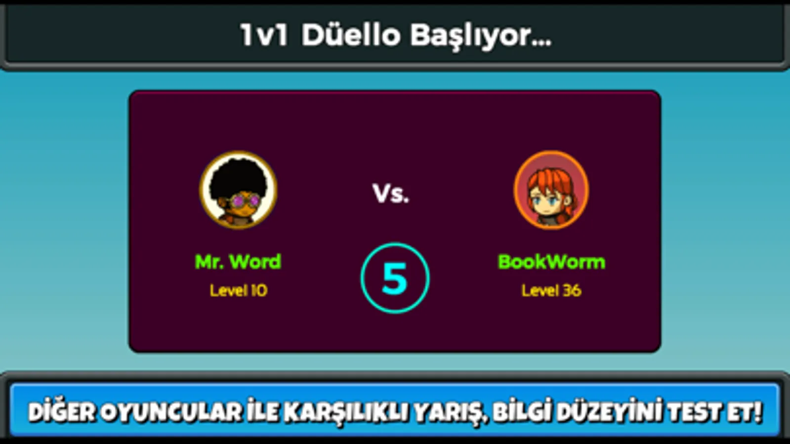 İşte tam da sana göre dopdolu ve zengin içeriği, keyifli oynanışı, anlamları verilen binlerce ingilizce kelime ve daha bir çok sıradışı özelliği ile yepyeni bilgi yarışması oyunumuz.