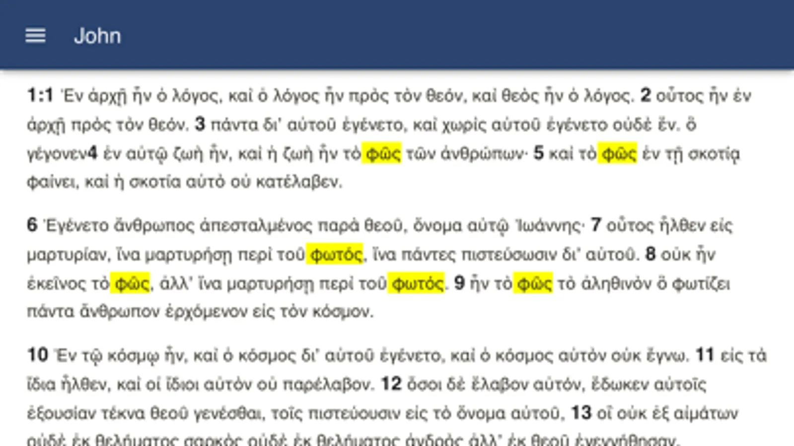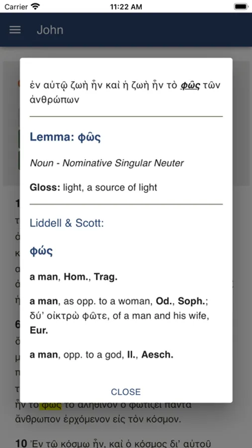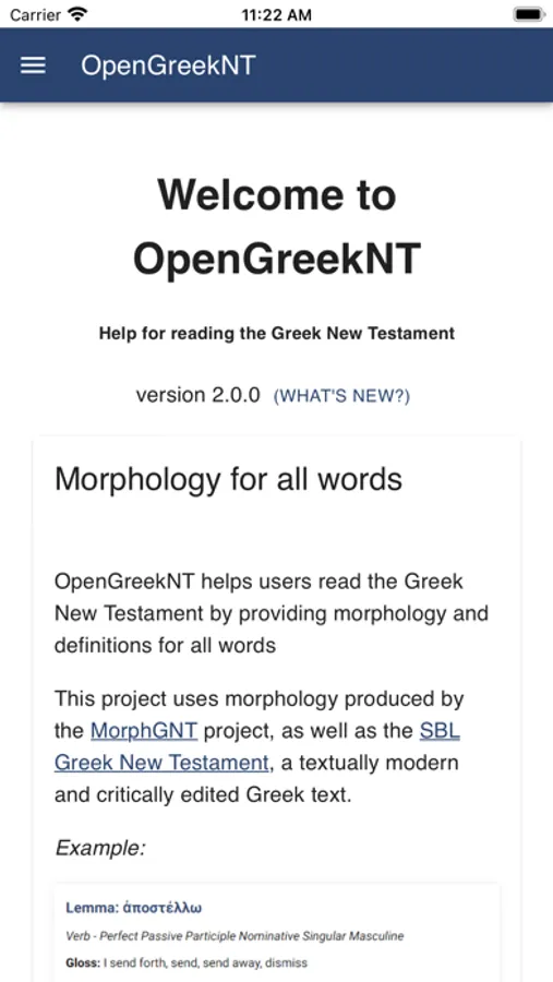 This project uses morphology produced by the MorphGNT project, as well as the SBL Greek New Testament, a textually modern and critically edited Greek text. Word definitions are available from Liddell & Scott (where applicable), along with glosses from John J. Dodson's public domain lexicon (2010).
