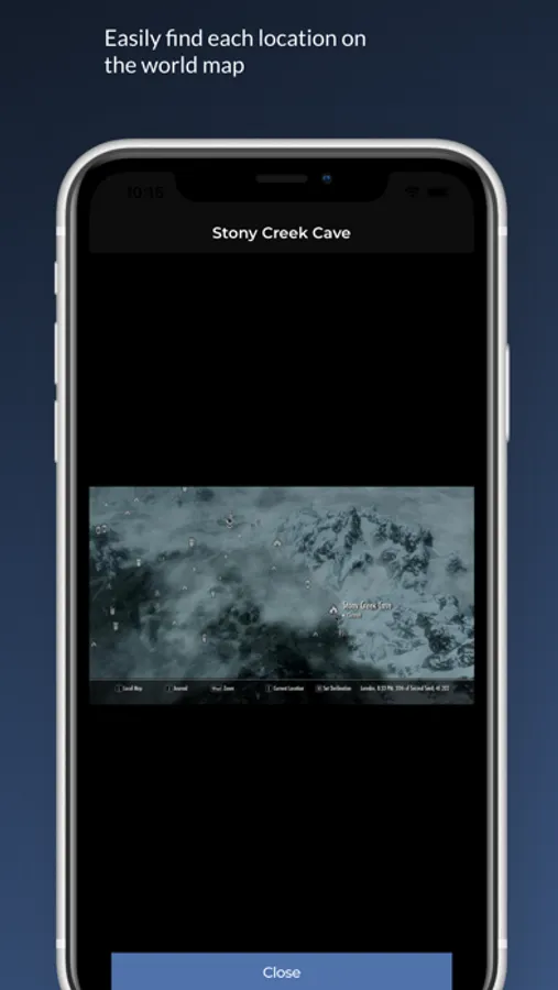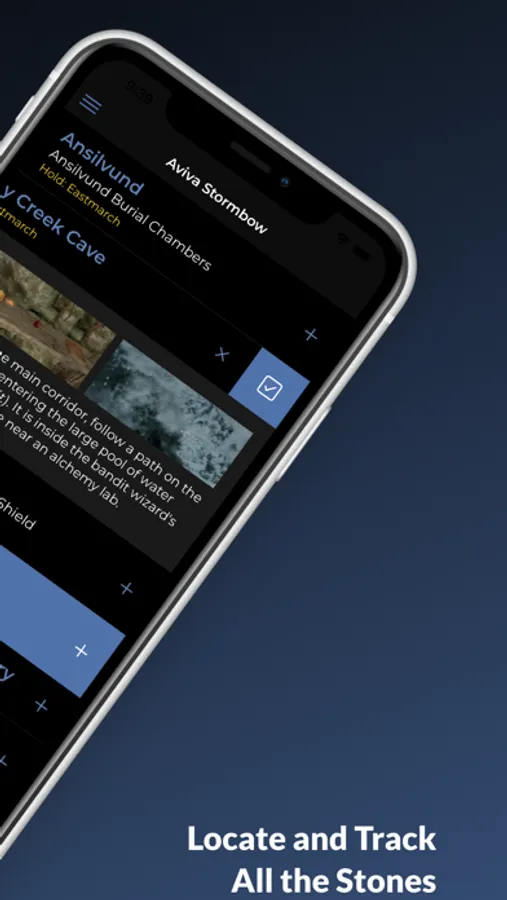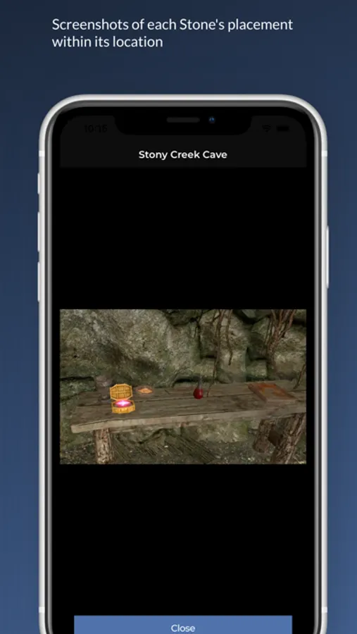 - Tap a Stone location in the list for location walk-through, including map and placement screenshots.