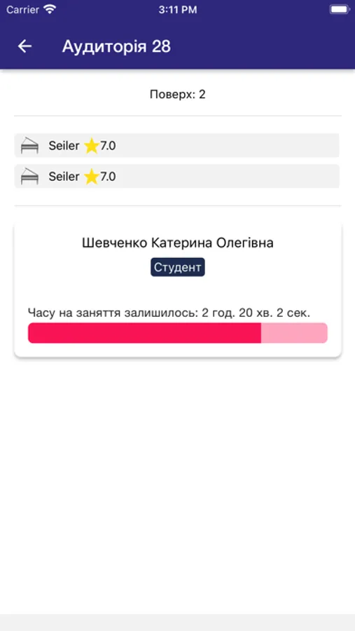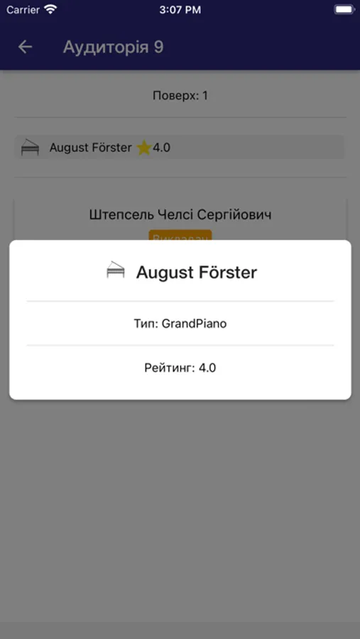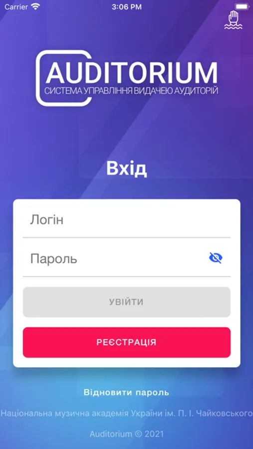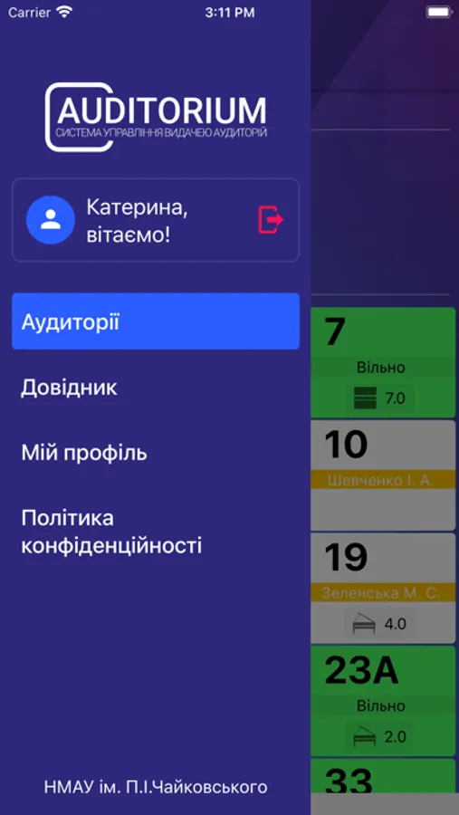 Auditorium - додаток для управління чергою за аудиторіями в вищих музичних учбових закладах, що дає можливість переглядати інформацію про вільні та зайняті аудиторії, інструменти та їх стан, довідник педагогів та інше.