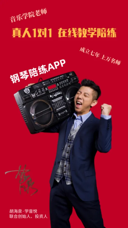 钢琴陪练 app 是一款在线高效匹配真人音乐老师进行一对一陪练的服务 app。由明星胡海 泉投资创办的学音悦网荣誉出品,为全球华人提供高效低价找老师服务。平台拥有数十万名 来自全球各大音乐院校的专业老师可供挑选,并提供包括在线陪练、在线教学、上门家教、 声乐指导、播音主持、乐器考级等全方位,音乐垂直领域的专业服务。