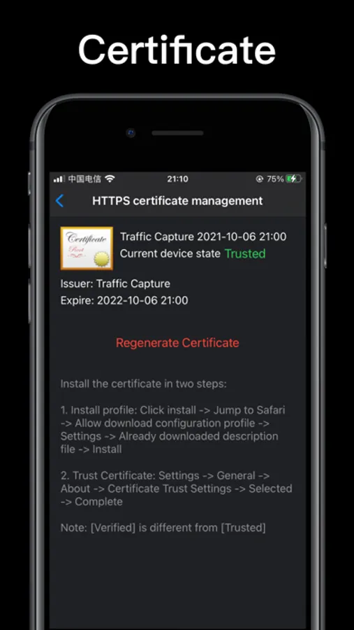 Certificate description file name: Traffic Capture YYYY-MM-dd HH:mm, where YYYY-MM-dd HH:mm is the time when the certificate is generated