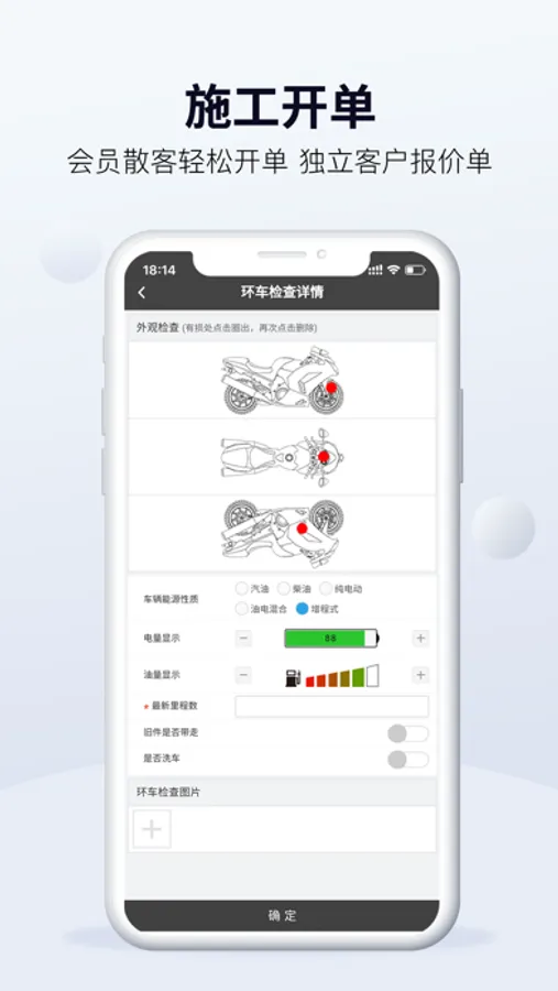 1、快速开摩托维修保养单,外观检查登记,客户签名;