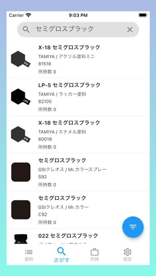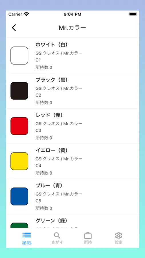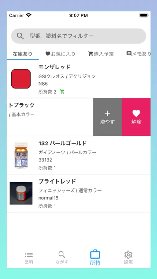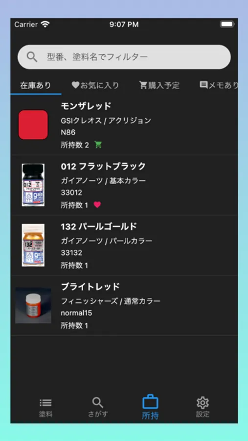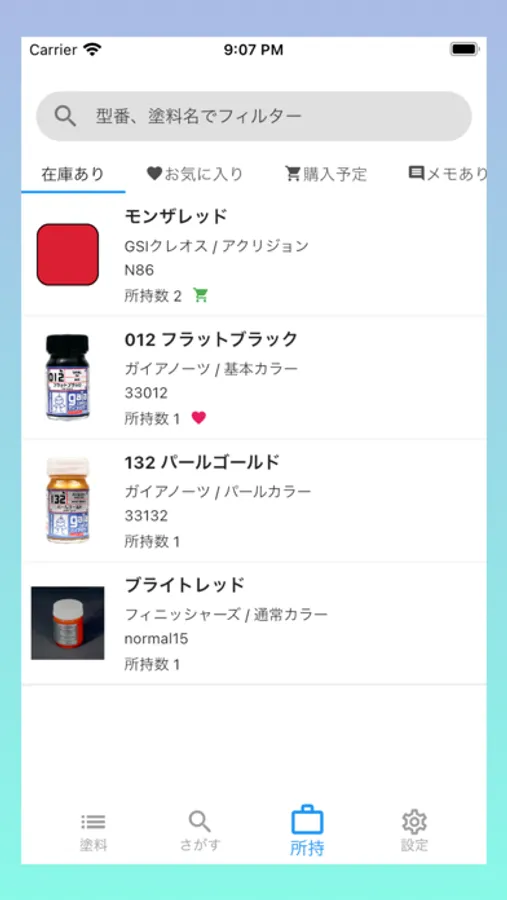 各塗料に所持数・お気に入り・購入予定・メモを記録することができます。