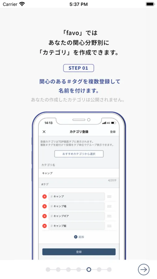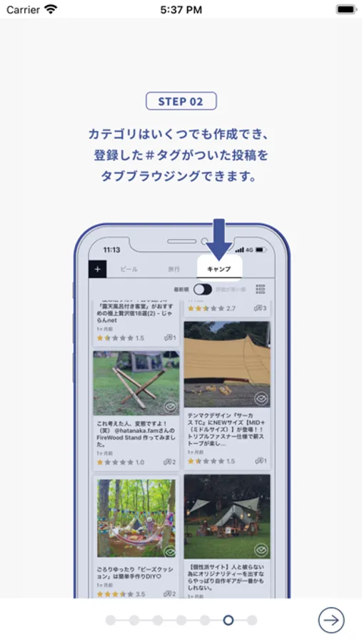 例:「キャンプ」という名前のカテゴリを作成し、#キャンプ、#キャンプ場、#キャンプギア、#キャンプ飯 といった#タグを設定すると、「キャンプ」という名前のタブブラウザがトップ画面に表示され、そのタブブラウザ上には上記4つの#タグいずれかが付いた投稿がすべて表示される