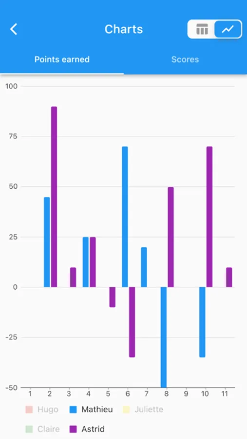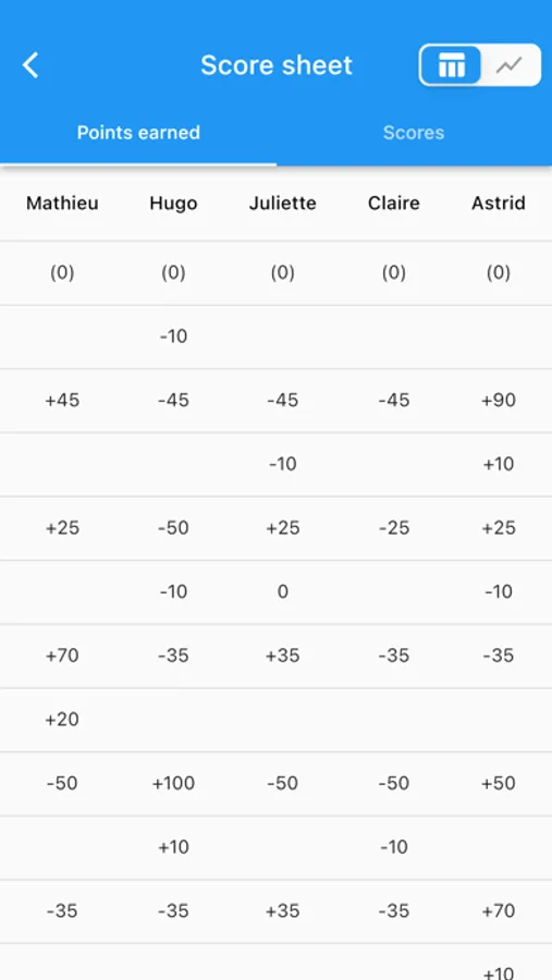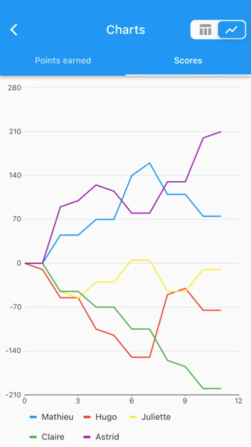 Colorful charts and score sheets let you visualize game progress over time in various ways.