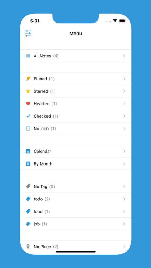 • Swipe right on a note to add a star or heart to the note, or pin the note.
