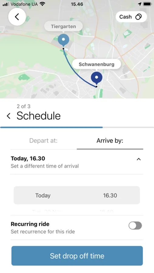 Select destination: Move map until marker is at desired destination or type address into search bar.