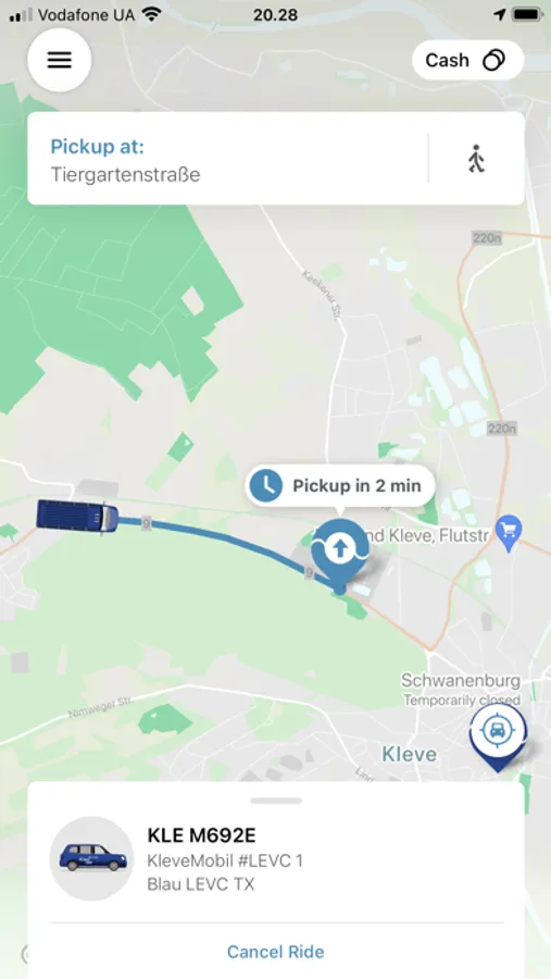 Select starting point: Locate KleveMobil app location, move the city map until the blue marker is at the desired pickup location or type the address directly into the search option.