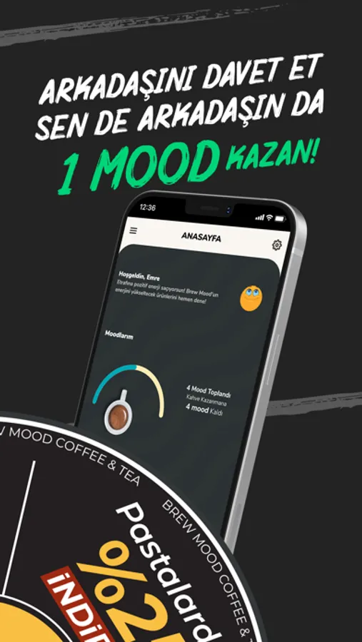 - Brew Mood Coffee mobil uygulamasına arkadaşını davet edebilir bu sayede sen de arkadaşın da 1 mood kazanabilirsin.
