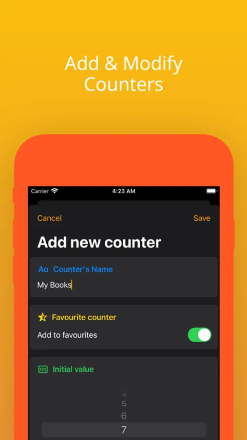 The application helps you in different counting cases. You can create multiple counters assigeed to your various situations. In each of them you can choose the increment, so how much you increase and decrease the result with one touch.