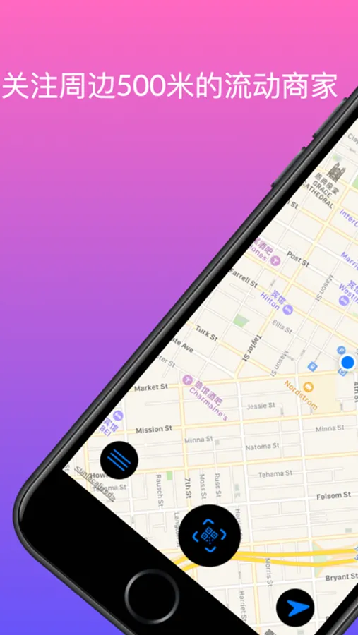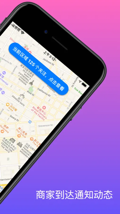 - 接收关注的流动商家最新地理位置(500米内)通知和动态。