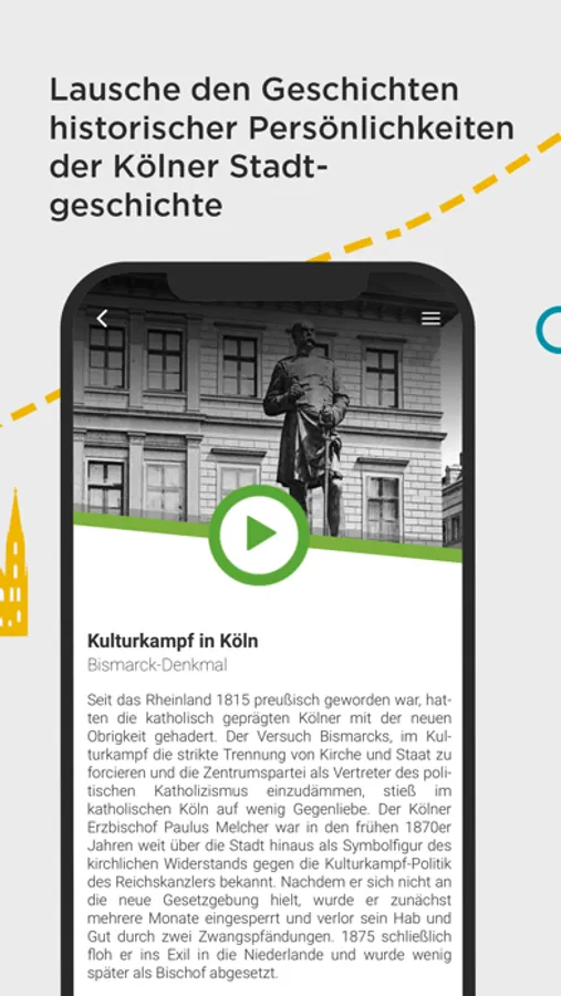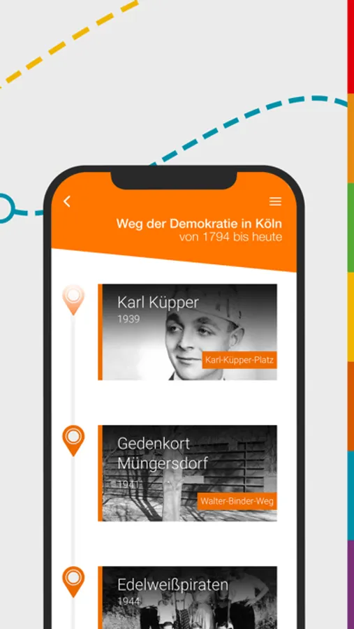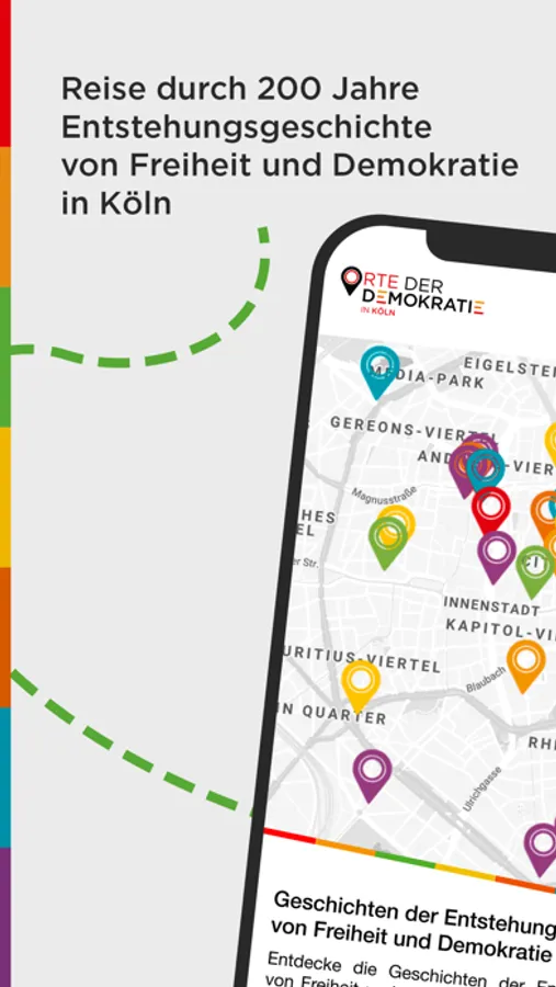 Begib Dich mit Deinem Smartphone auf eine multimediale Spurensuche und erlebe die Geschichten der Entstehung von Freiheit und Demokratie in Köln vor Ort. Beginne in der Zeit Napoleons, entdecke die Preußen- und Kaiserzeit, die Zeit der Weimarer Republik, des Nationalsozialismus, der Bonner Republik und ende im Heute. Erkunde dabei die historischen Orte im Kölner Stadtgebiet, an denen die Geschichte von Demokratie und Freiheit in Köln und darüber hinaus geschrieben wurde.