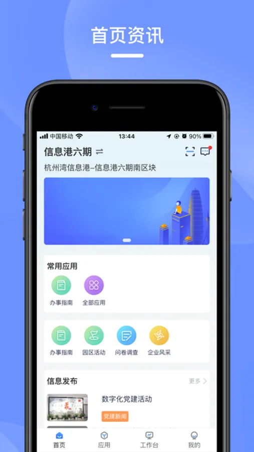 数智e港,是为杭州湾信息港的园区管理者,园内企业,企业员工、访客人员打造的一款移动便捷APP。整合了园区公告、会议室预定、物业报修、访客申请、停车缴费等服务,并同步植入了园区党建、政策解读、企业风采、服务联盟模块,为每一位用户营造更安全、更便捷的一体智慧园区生活体验。