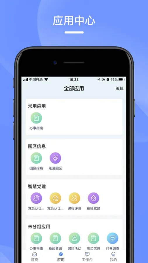 首页:应用快捷入口,通知公告、园区活动一键报名