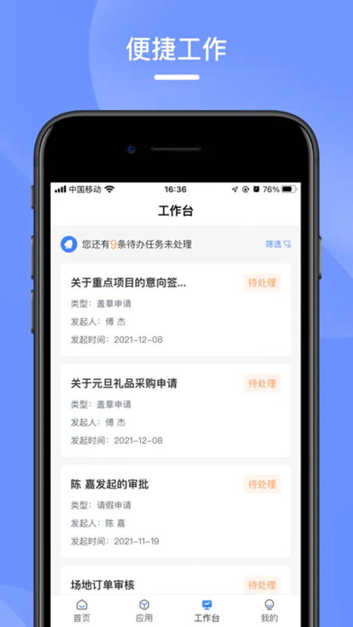工作台:场地预约、项目申请、设备巡检和物业巡更等待办任务