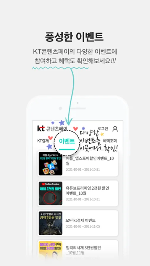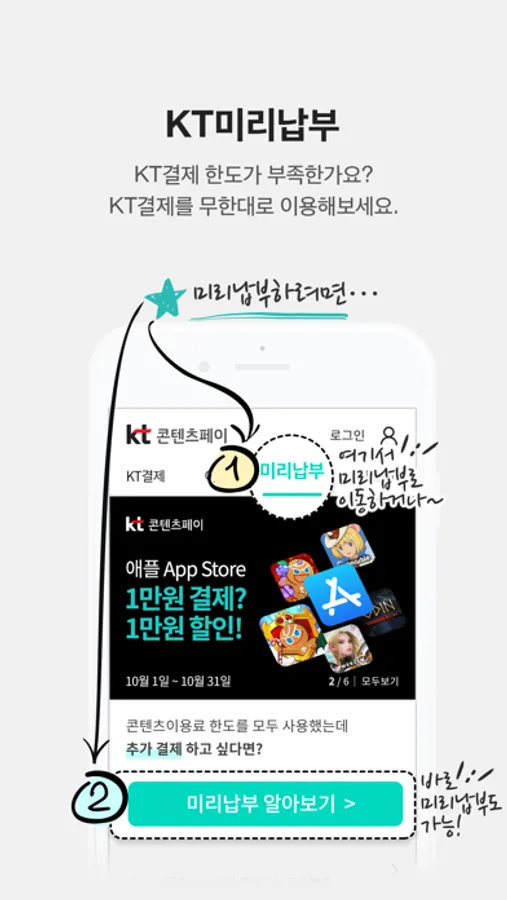 이 콘텐츠페이 앱만 있으면 이런 간편한 KT결제를 무제한으로 이용할 수 있어요. KT 콘텐츠페이를 통해 간편하게 미리납부하시고 다양한 혜택과 고객님에게만 드리는 숨겨진 혜택도 놓치지 마세요