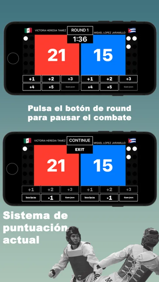 El combate puede ser pausado pulsando el botón de round y reanudarlo las veces que se requiera, se cuenta con el sistema de puntuación actual de la WTF que va de 1 a 5 puntos, también se puede amonestar !Cuidado! si llegas a las 10 amonestaciones perderás el combate.