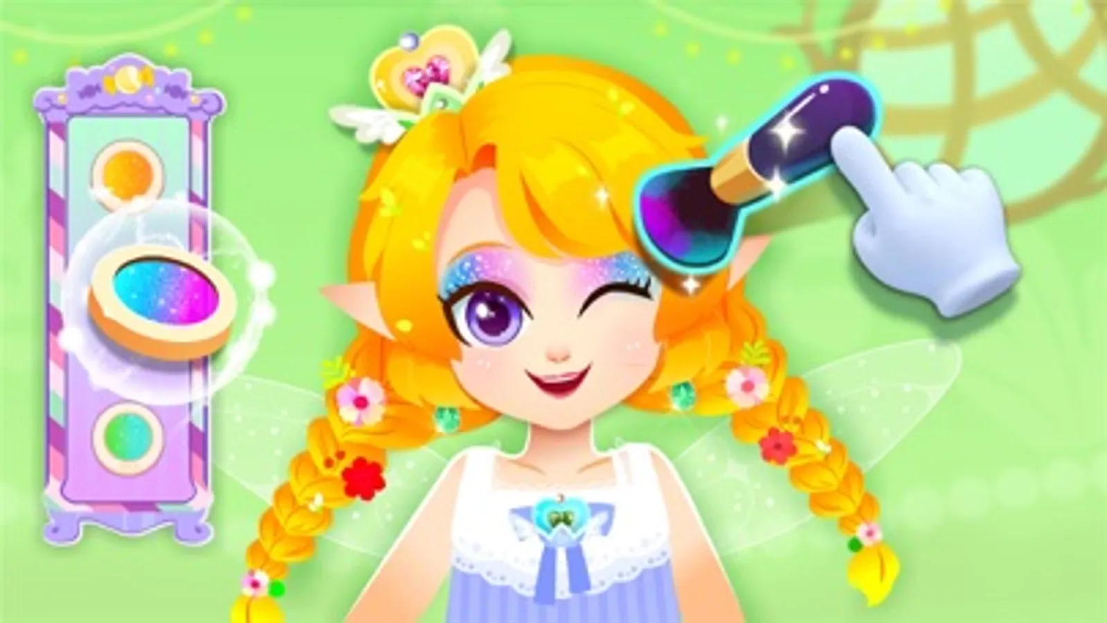 First, let's choose cosmetic contact lenses for Princess Mermaid. And then put on eye shadow. Wow! The princess's eyes are getting sparkling! There are also lipsticks in different colors. Give it a try!