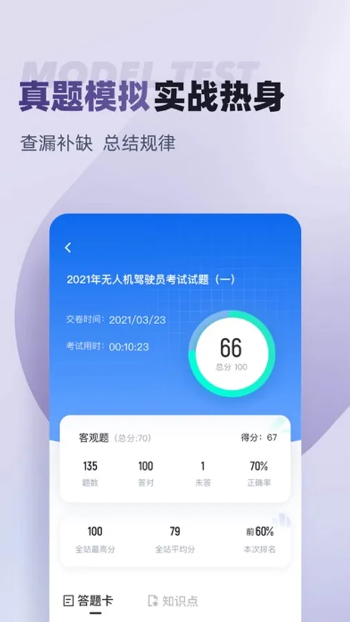 应用内精选汇集历年考试真题及高质量模拟试卷,严格依据最新考试大纲与命题规律精心编写。通过模拟考试功能,您可体验真实考场环境,进行全真限时测试。考试结束后,系统即时生成详细分析报告,清晰展示您在航空法规、飞行原理、气象知识、操作技能等各模块的掌握情况。智能评估系统精准定位知识薄弱环节,帮助您明确复习重点和改进方向。