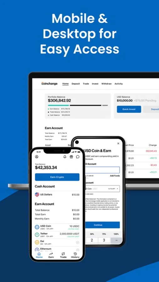 Getting started is easy! Simply transfer USD from your bank or receive crypto from a third-party wallet or exchange to start earning compounding returns in your Coinchange Earn Account. Don’t just HODL, earn crypto on your crypto!