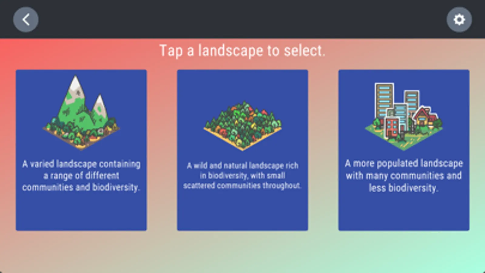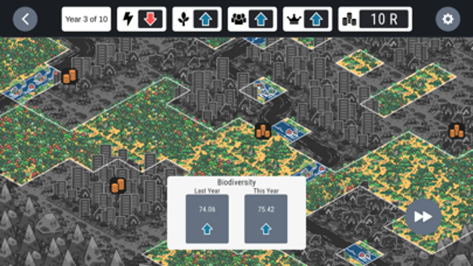 As you manage different landscapes you will see them change. You’ll also be able to track how your decisions on investing resources can boost energy generation, lead to greater biodiversity, and increased prosperity of communities. Your choices can also cause these to decline…