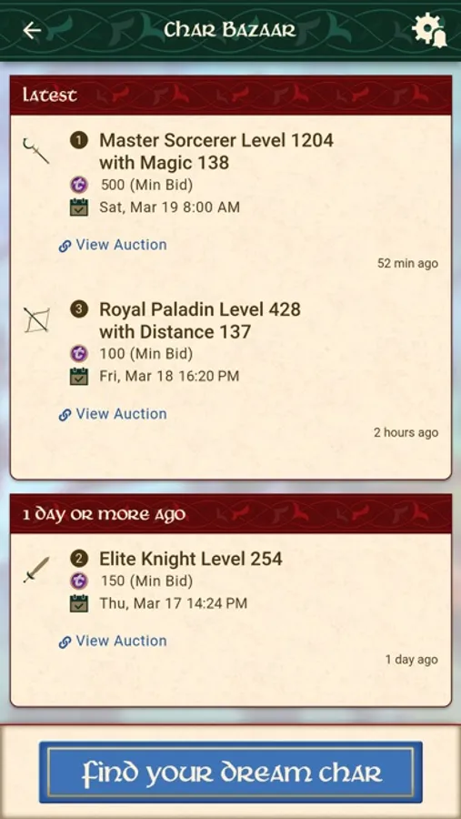 FIND YOUR DREAM CHARACTER: Tell the app what characters you are interested in and receive notifications when they are up for auction in the Char Bazaar. Select filters for game world and type, level, vocation and skill.