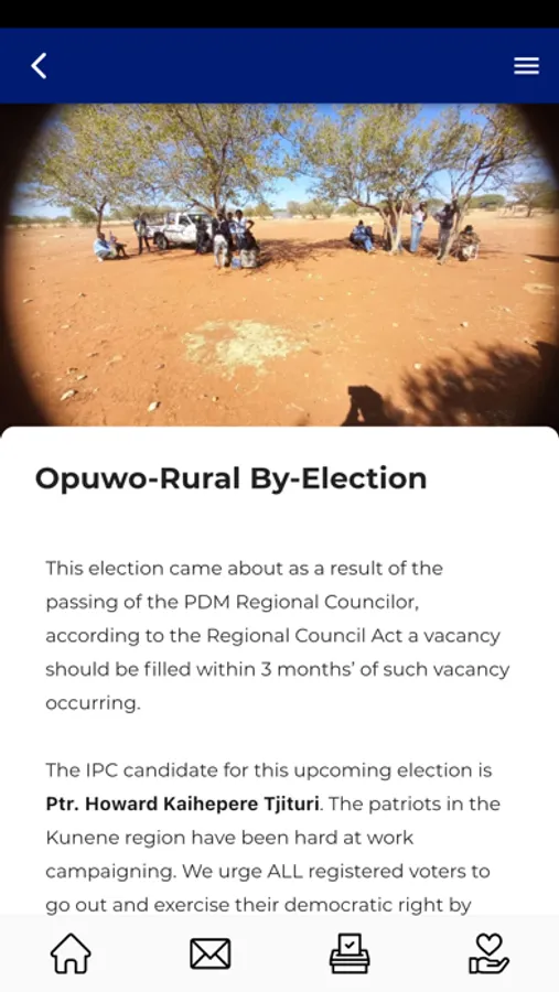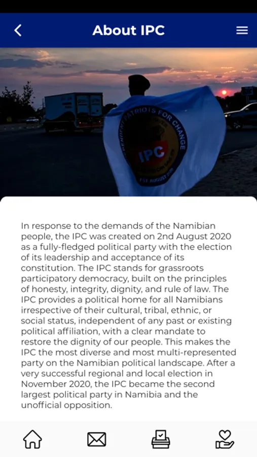 created on 2nd August 2020 as a fully-fledged political party with the election of its leadership and acceptance of its constitution. The IPC stands for grassroots participatory democracy, built on the principles of honesty, integrity, dignity, and rule of law. The IPC provides a political home for all Namibians irrespective of their cultural, tribal, ethnic, or social status, independent of any past or existing political affiliation, with a clear mandate to restore the dignity of our people. This makes the IPC the most diverse and most multi-represented party on the Namibian political landscape. After a very successful regional and local election in November 2020, the IPC became the second largest political party in Namibia and the unofficial opposition.