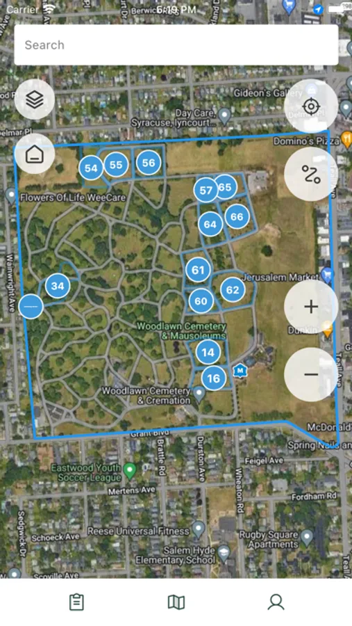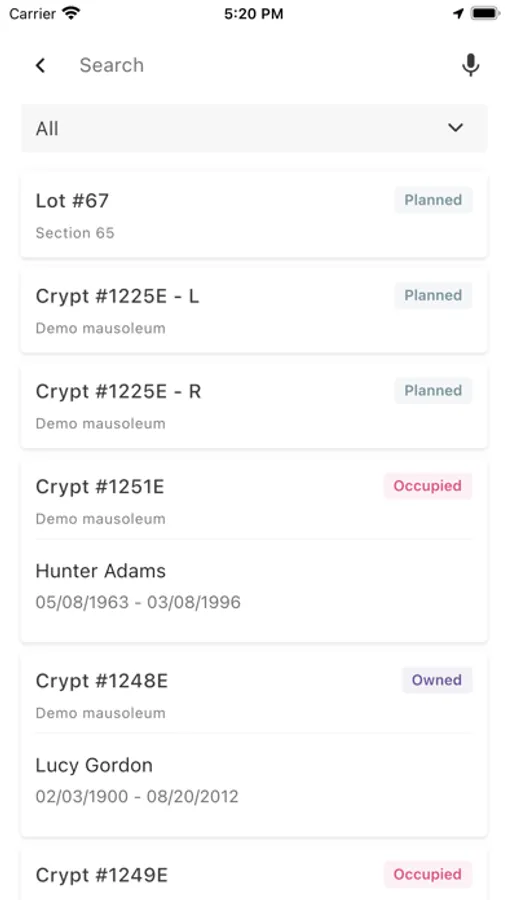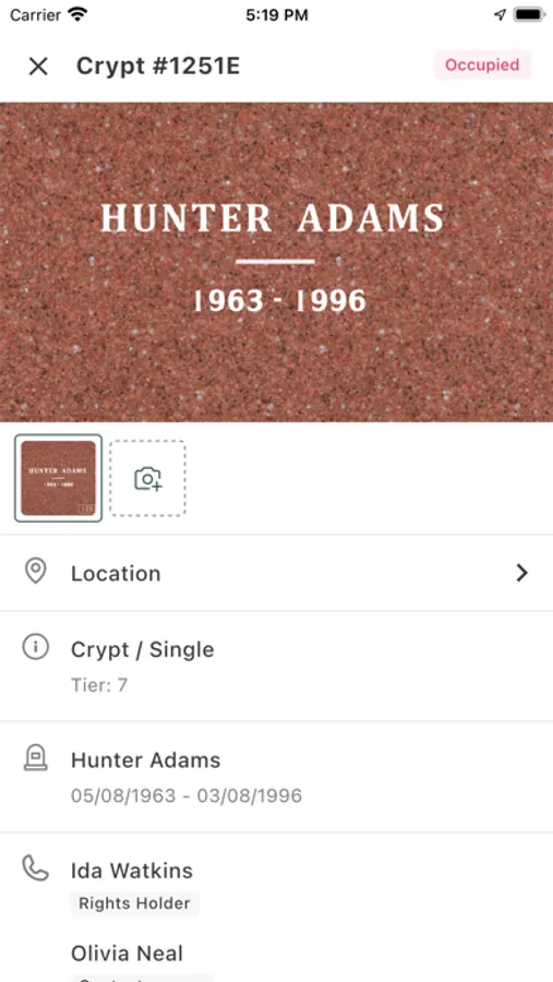 Displays the most important information about the burial in the palm of your hand.