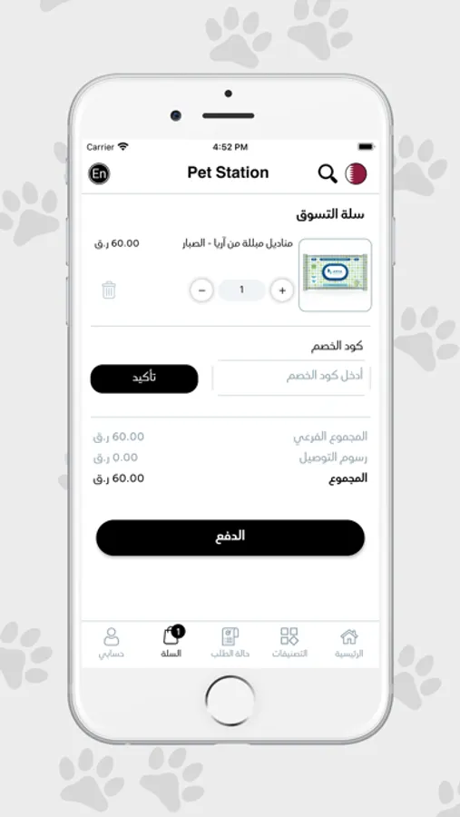 تطبيق بيت ستيشن هو المكان الذي ستجد فيه جميع أنواع المنتجات الخاصة بالحيوانات. ويمكنك الشراء من التطبيق الذكي من خلال الخطوات التالي: ادخل إلى التطبيق ثم النقر على التصنيف الذي يعجبك وعندها أضف ما تريد من المنتجات إلى عربة تسوقك. بعد ذلك أكمل عملية الطلب باختيار طريقة تحصيل طلبك وآلية الدفع التي تناسبك وأضف جميع المعلومات الأخرى المطلوبة.