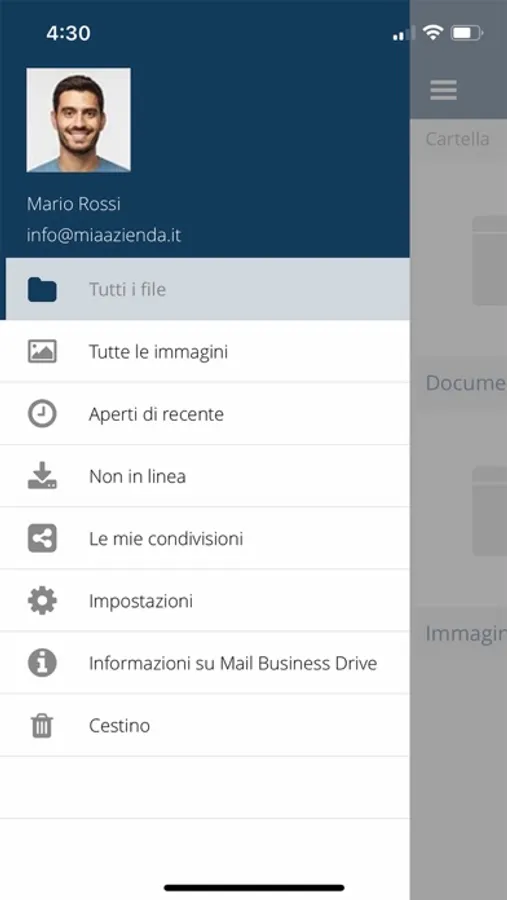 Distinguiti con il tuo spazio cloud in cui salvare tutti i tuoi file e documenti. Potrai avere sempre con te e a portata di mano sulla tua app Mail Business Drive file, documenti, foto e video necessari per la tua attività.