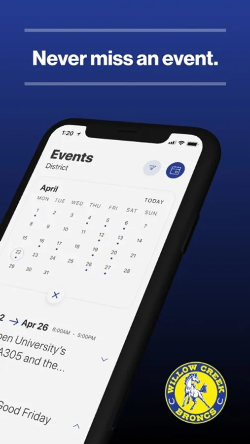 The event section shows a list of events throughout the district. Users can add an event to your calendar to share the event with friends and family with one tap.