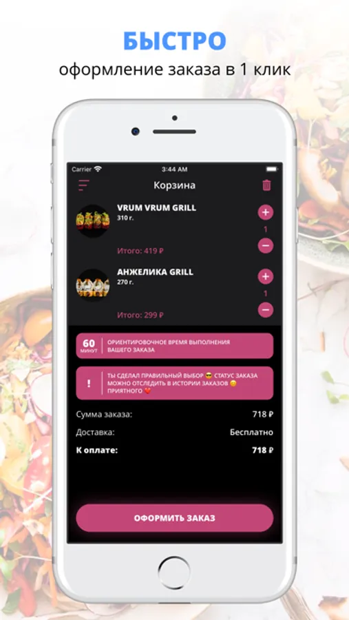 Скачивайте наше приложение, оформляйте заказ и наслаждайтесь любимой едой, где бы Вы ни были! Приятного аппетита!