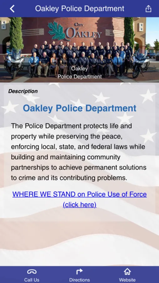 On behalf of the men and women of the Oakley Police Department, welcome to our app. This app is for the employees and family members of the Oakley Police Department as well as the community it serves. It contains information about our department as well as safety and crime prevention tips. Oakley Police Department employees will have access to a full range of wellness tools.
