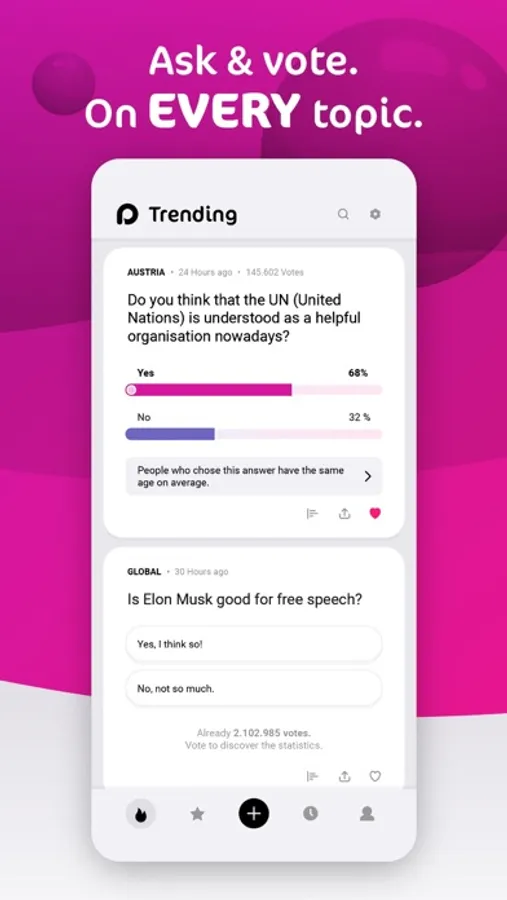 We are the first platform where the direct opinion of the general public can be seen in a completely independent manner. Ask what has always interested you and receive results and statistics.