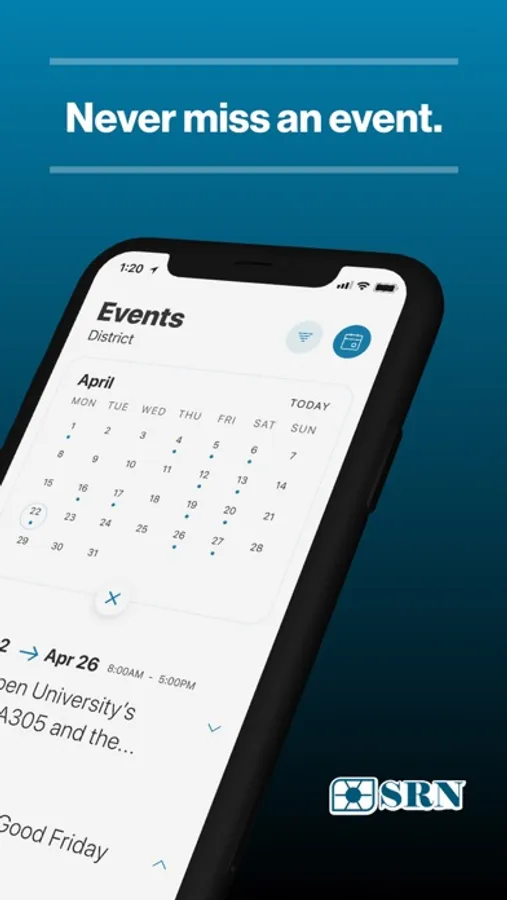 The event section shows a list of events throughout the district. Users can add an event to your calendar to share the event with friends and family with one tap.
