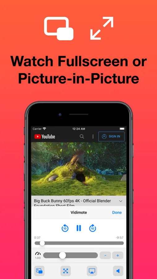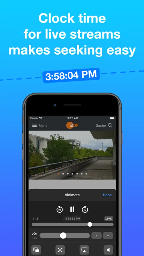 • SPEEEED: watch videos at up to 2 x original speed, finely adjustable in 5% steps. Save time watching videos - without missing out on any content. Or watch a live stream's recorded part at increased speed - until you're "back to live".