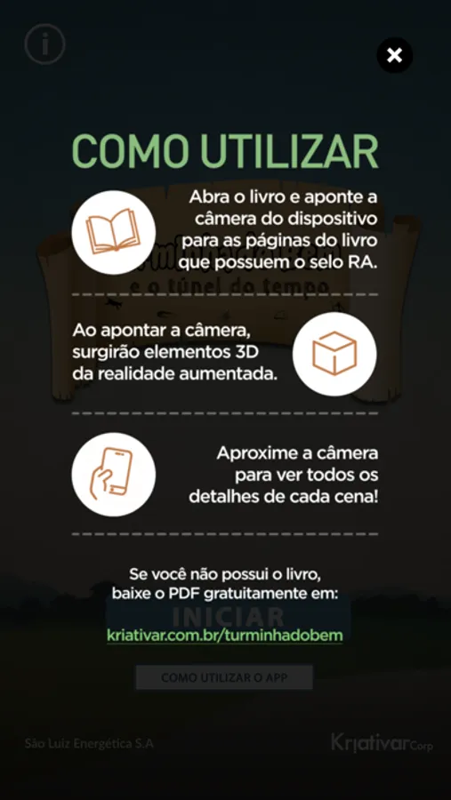 3- Depois de terminar a leitura ou o jogo, ou no momento que você quiser, abra o app, selecione a interação desejada e aponte a câmera do celular para as páginas dos livros ou para os cards que possuem o selo de AR.