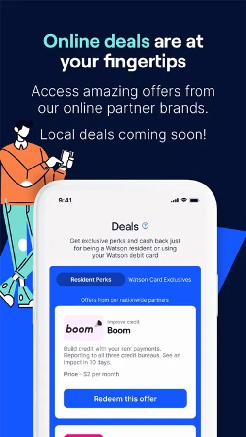 We also offer exclusive online deals and discounts with partner brands like Lemonade renters insurance, Boom rent reporting to the credit bureaus, and Instacart grocery delivery. Local deals are coming soon, too.