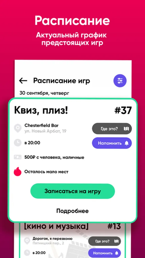 • Возможность просмотра расписания игр с подробной фильтрацией поиска;