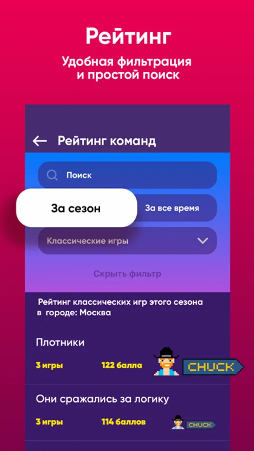 • Подробный рейтинг команд с удобной фильтрацией и простым поиском;